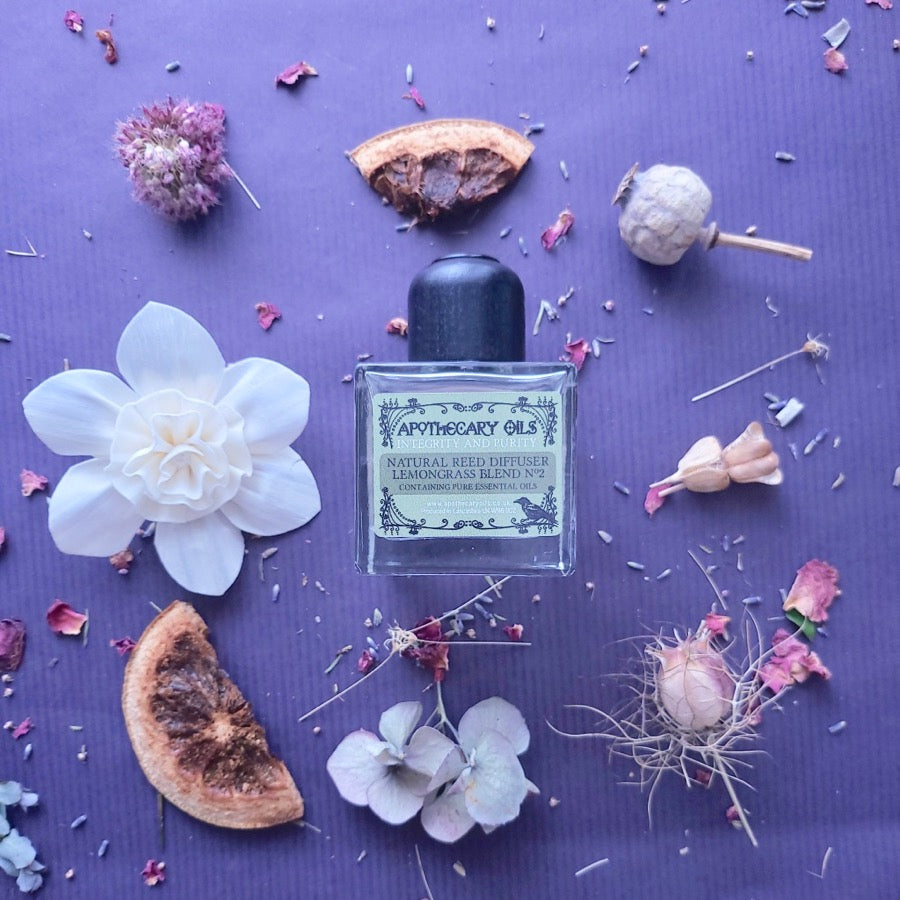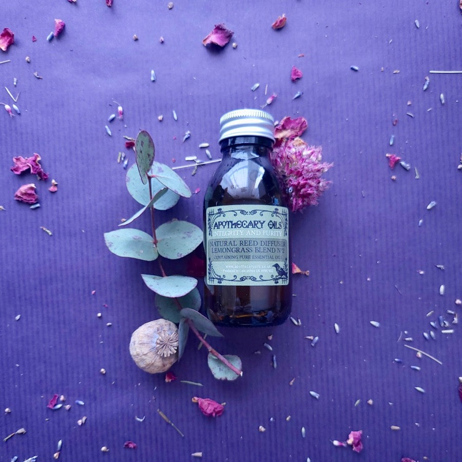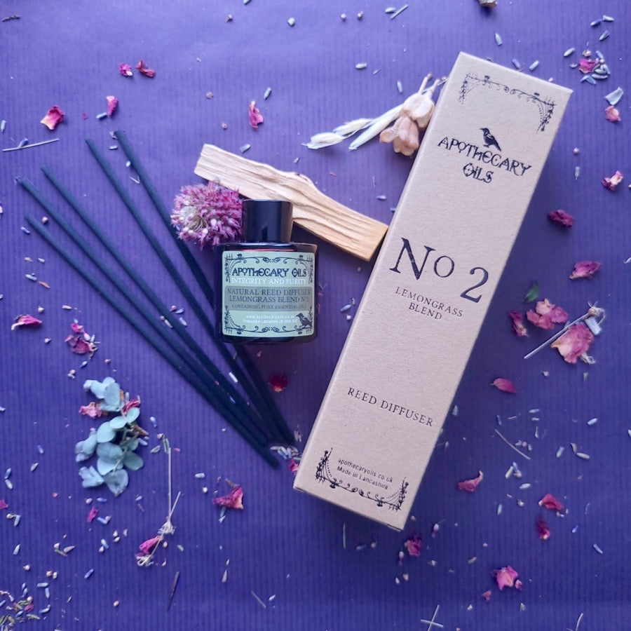 Regular 50ml size comes with black fibre reeds and is packaged in a card Apothecary Oils box.