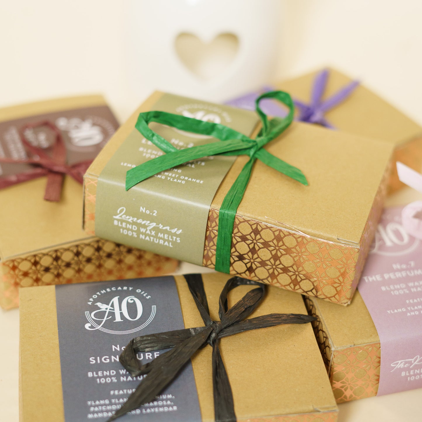 The wax melts come in a card Apothecary Oils box with a minimum weight 50g, approx 8-12 wax melts per box.